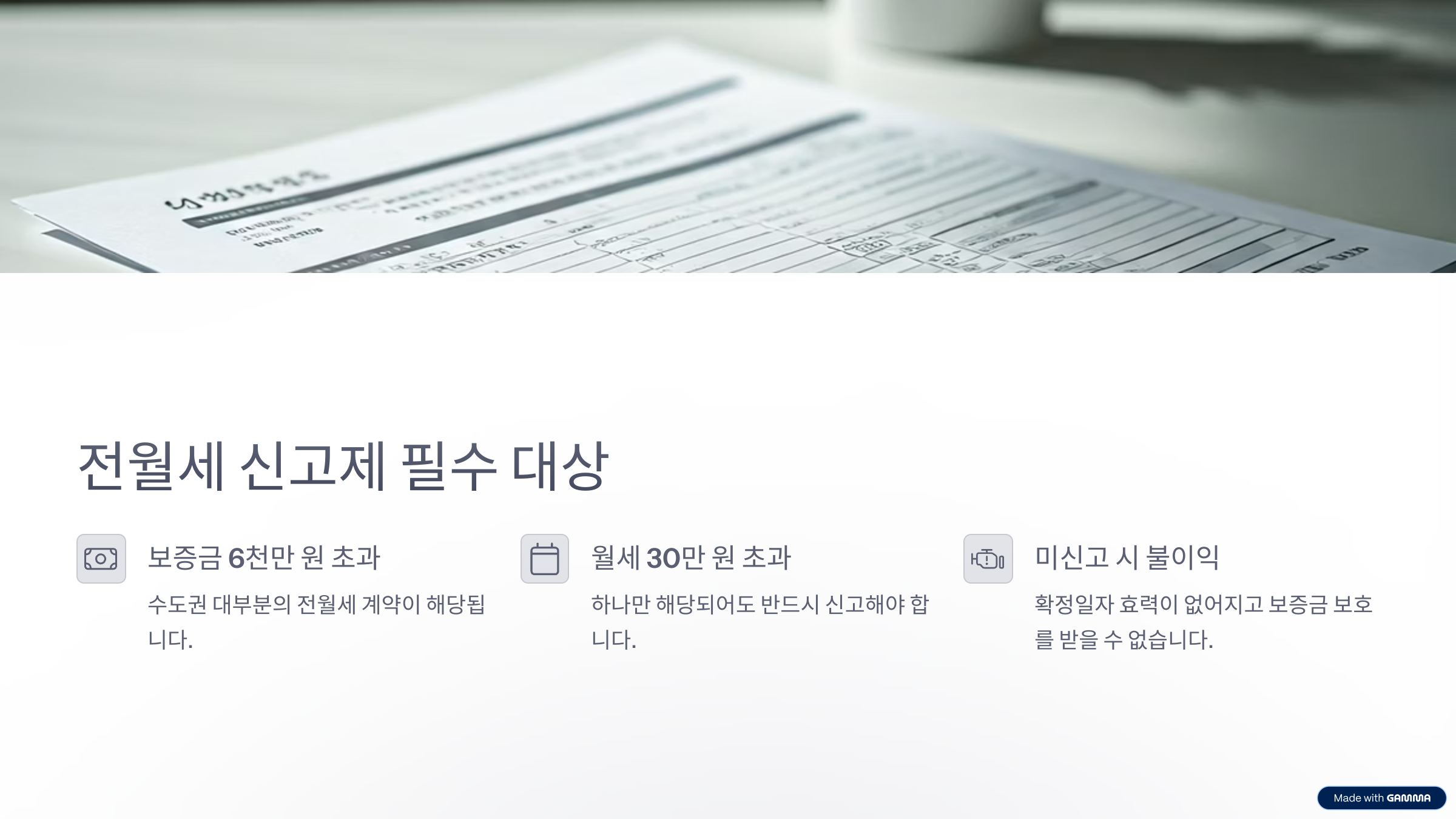 이 기준 중 하나만 해당되어도 신고 의무가 생깁니다. 특히 대부분의 수도권 전월세 계약은 이 기준을 초과하기 때문에, 사실상 거의 모든 거래가 해당된다고 봐도 무방해요.