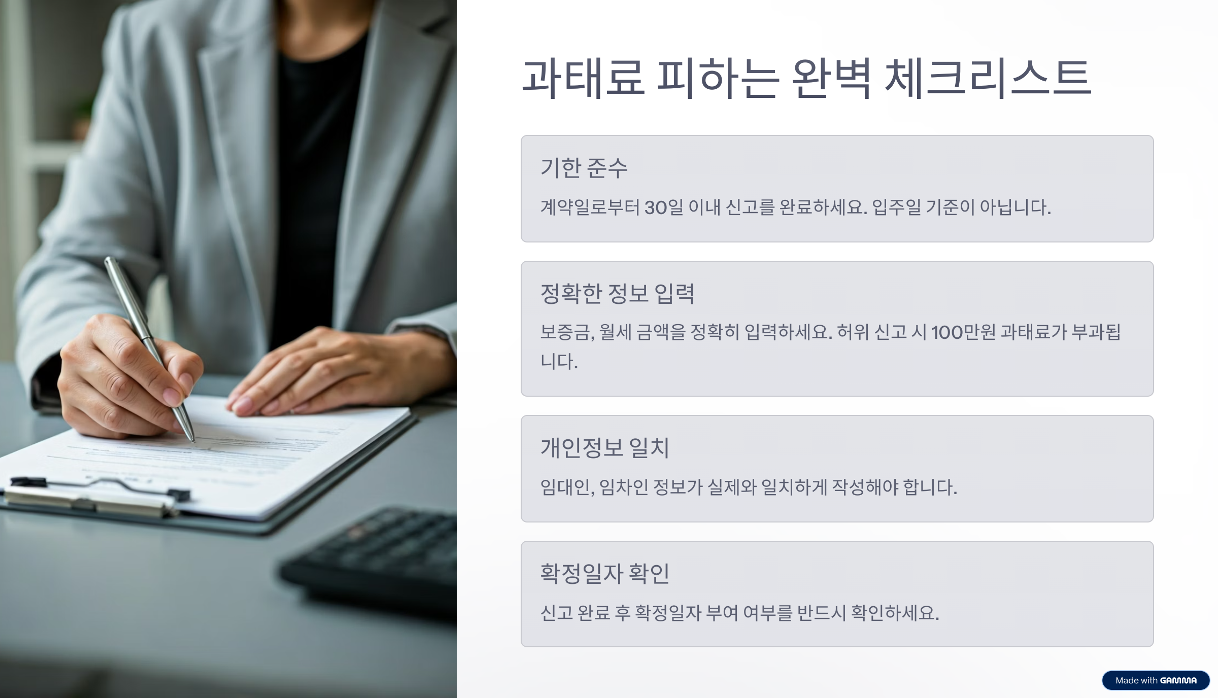 중요한 건 ‘계약일’ 기준이라는 점이에요. 예를 들어 5월 10일에 계약하고 7월 1일에 입주하더라도, 6월 9일까지는 반드시 신고를 마쳐야 하죠. 신고 기한을 놓치면 확정일자 효력도 사라질 수 있고, 과태료까지 부과될 수 있으니 유의해야 합니다.